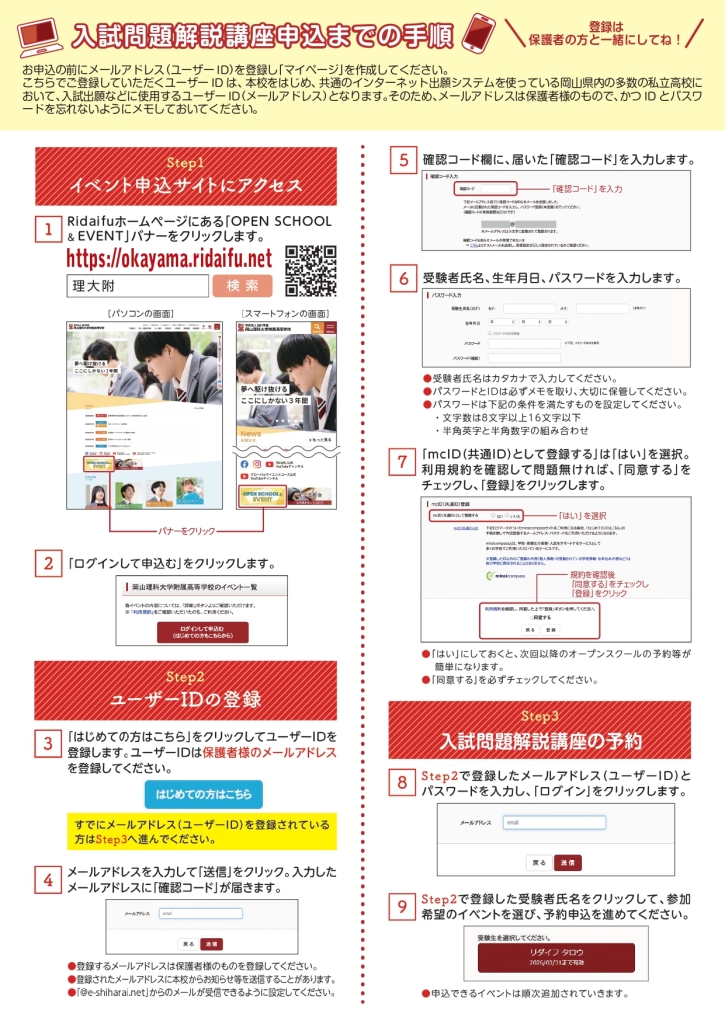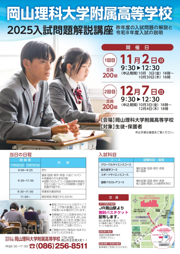 中学生と保護者の方が対象です。昨年度の入試問題の解説と、令和8年度の入試の説明を行います。この機会にぜひご参加ください。