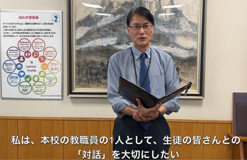 最後に。私は本校の教職員の一人として、生徒の皆さんとの「対話」を大切にしたいと考えています。「しんどいな」、「校長先生でもいいから話を聞いてほしいな」と思った生徒の方は、先生を通してアポを取ってください。決して一人でしんどさを抱え込まないでほしいと思います。皆さんは決して一人ではありません。以上が私からのメッセージです。