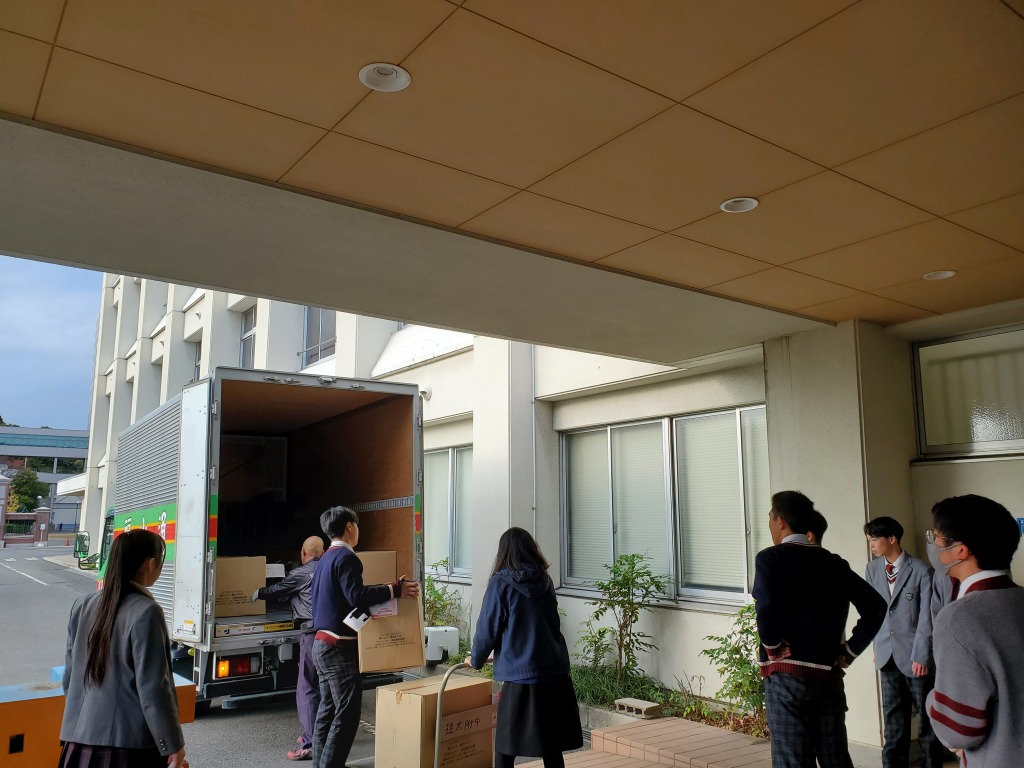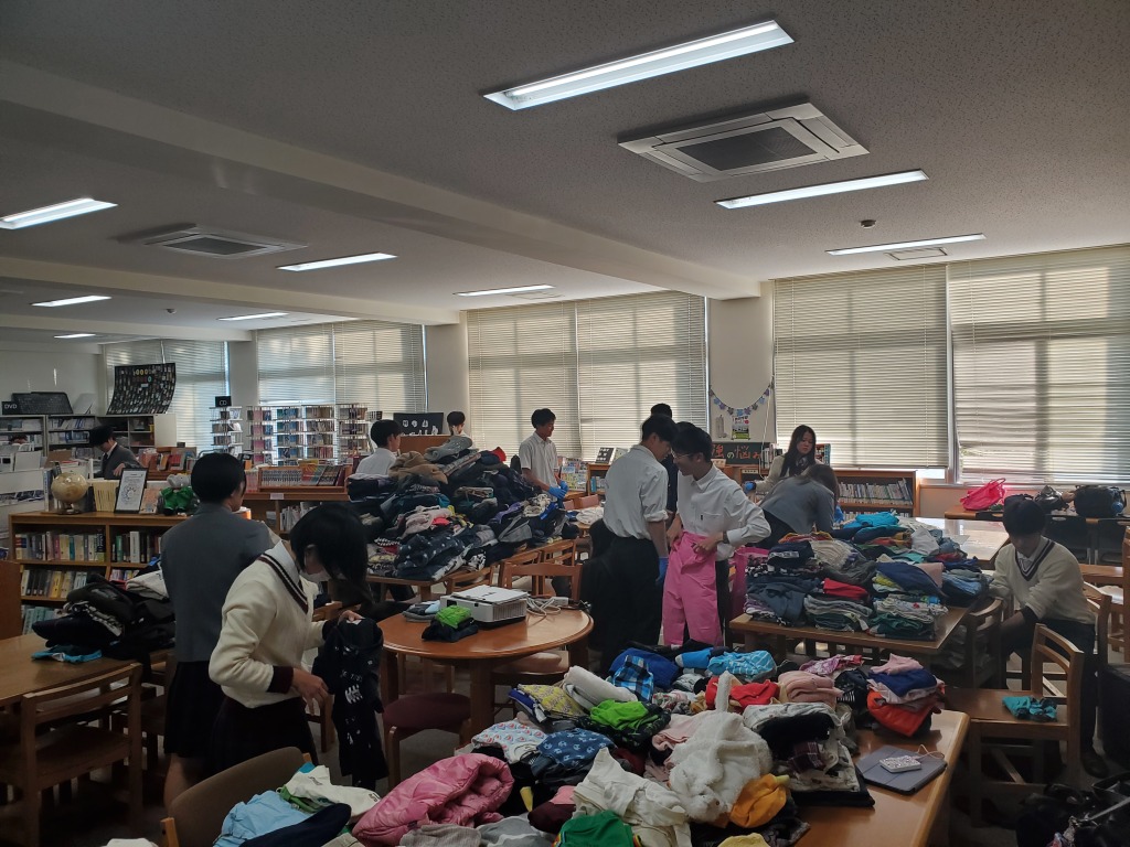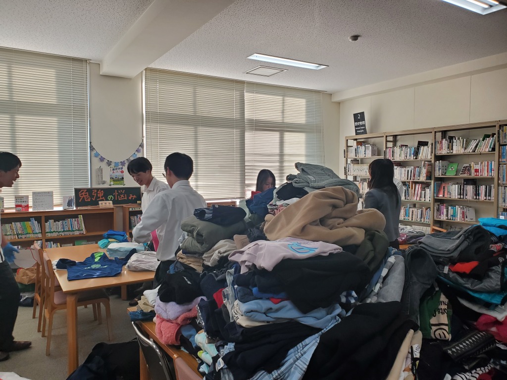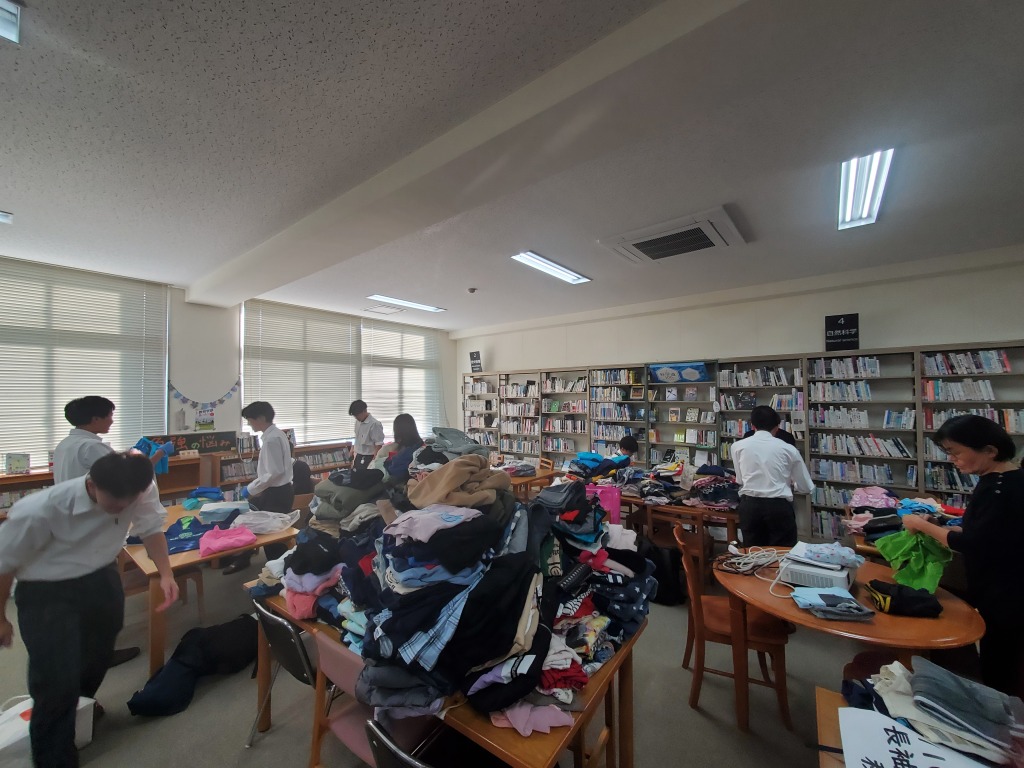 この活動は、身の回りの着なくなった子ども服を集め,それを難民の子どもたちに届けるプロジェクトです。着なくなった子ども服の回収についてポスターを作成し、全校や関連校である岡山理科大学附属中学校や岡山理科大学にも呼びかけました。7月から募集を開始し、約3か月で1291着の子ども服が集まりました。今年度は、生徒会執行部、ボランティア同好会と一緒に協力して仕分けをして14箱に箱詰めし、11月17日に無事発送しました。