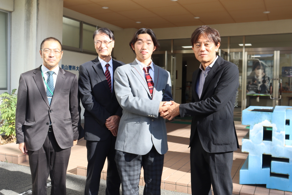 岡山城の烏城公園で10月2~5日に開催された「第9回全日本BMXフリースタイル選手権大会」(公益財団法人日本自転車競技連盟主催)で3位に入った本校3年、上村竜生(たつき)選手が10月24日、加計学園の加計役理事長に成果を報告しました。