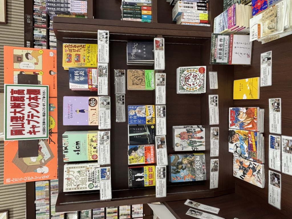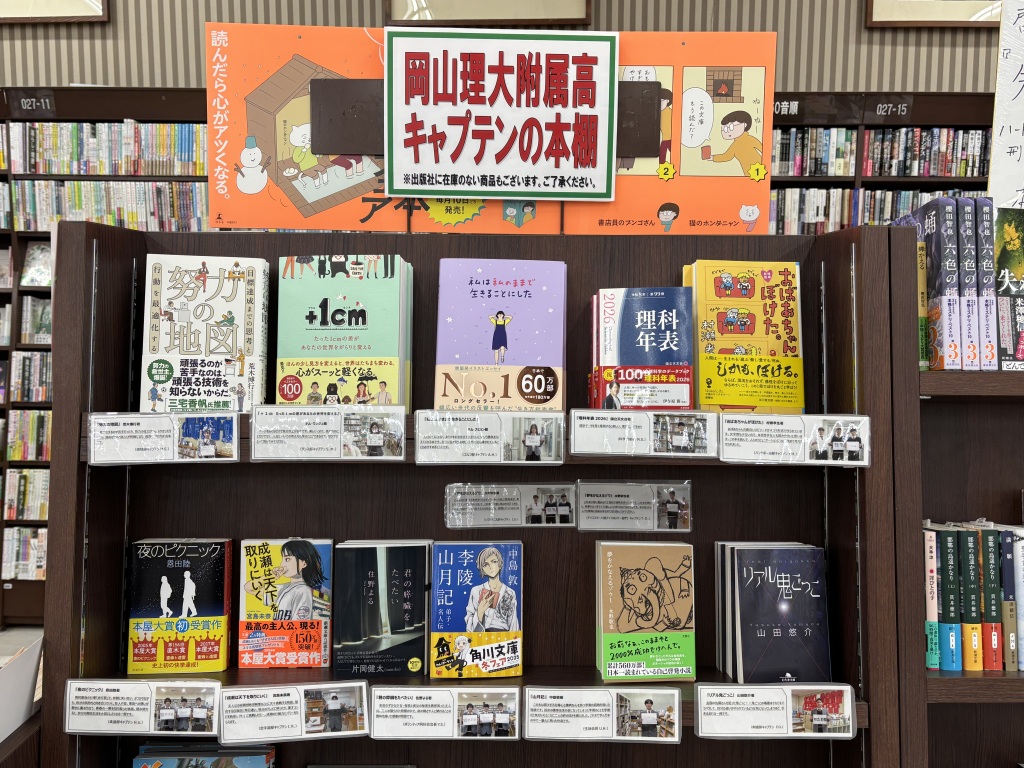 啓文社・岡山本店(岡山市北区下中野)で、理大附属高校「キャプテンの本棚」の企画展示が行われています。高校3年生の部活のキャプテン、部長がおすすめする本についてのコメントが本人の写真と一緒に展示されています。小説、エッセイ、絵本、漫画など様々なジャンルの本が紹介されています。令和8年1月下旬頃まで展示予定です。お近くにお立ち寄りの際は、ぜひご覧ください。