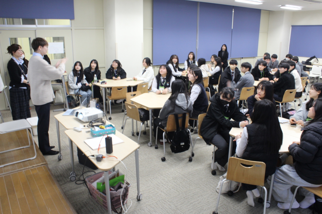 大学の施設の1つである好適環境水のカワハギやウナギの稚魚などの水槽の見学から始まり恐竜博物館で館員の先生からお話を聞き、GSコース1年生と一緒に英語と日本語の楽しいアクティビティーの授業を受講しました。日本人と同様に韓国人も、日本語と韓国語の言葉のバリアを超えた、生徒たちの夢中に食いついた、普段見せない様子でした。