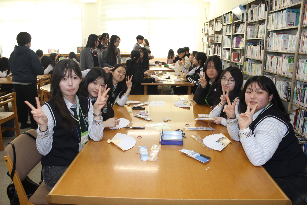 午後は図書館で扇子作り・浴衣や法被の試着・日本や韓国の昔遊びを体験できました。ゆっくりと時間が流れる中で、交流ができることのありがたさを感じました。