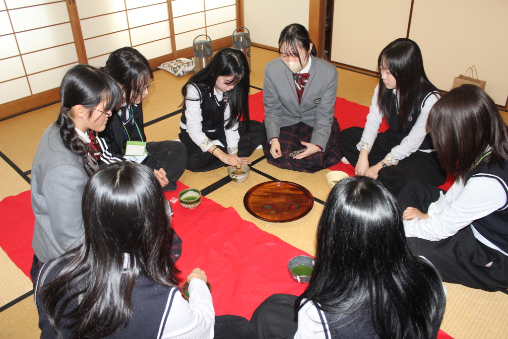 いつも通りの落ち着いた雰囲気のお茶室で、茶道部によるお点前を美味しいお菓子と共にいただくことができました。実際お茶筅をふってお茶をたてる体験もできました。韓国の高校生の1人からの言葉に、お抹茶をいただき、奥深い本物のお茶を初めていただくことができた、と喜んでくれました。