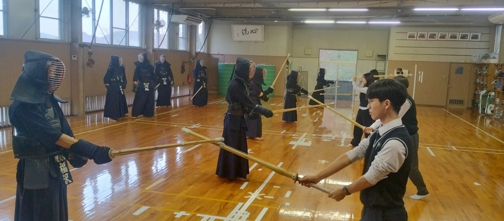 本校の柔道部・剣道部・弓道部・相撲部など日本の伝統的な武道のパフォーマンスを見たり、実際道具を使ったり、組合いをして体験をさせていただくこともできました。岡山理科大学附属高等学校ならではのサービス精神で、韓国の高校生は大満足の様子でした。