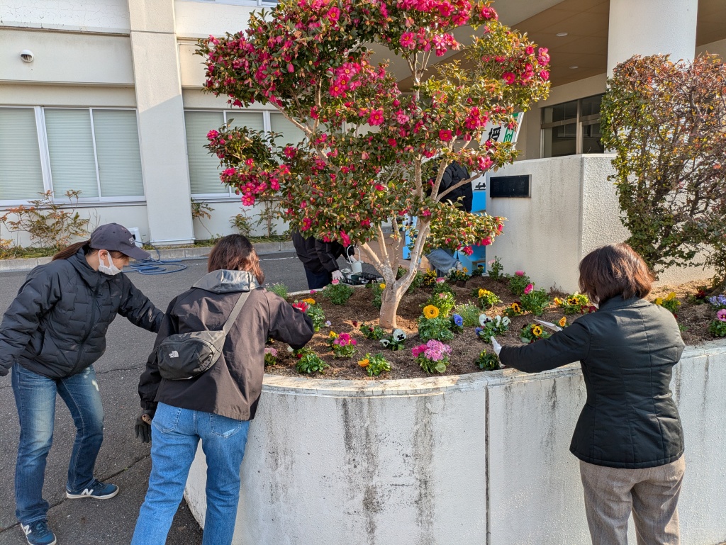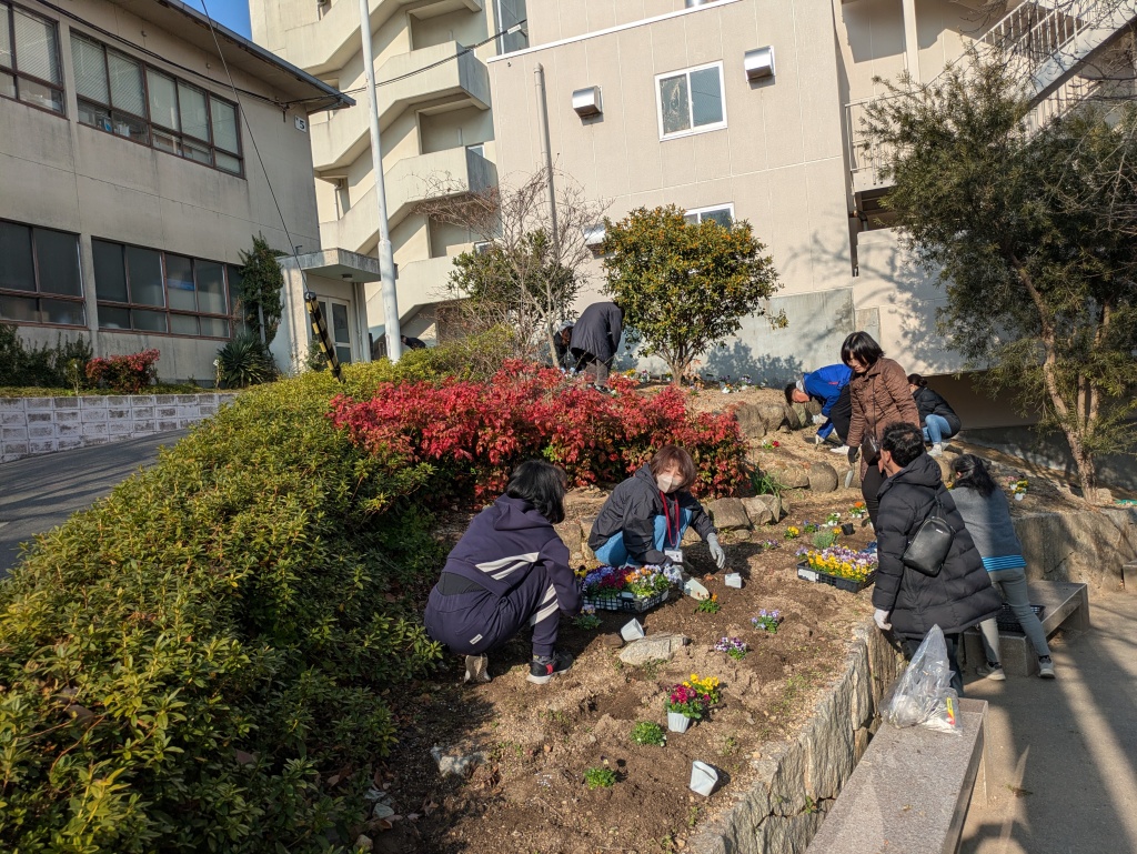 PTA環境美化委員会の皆さんが、卒業式を最高の形でお祝いするために、心を込めて花壇の整備と植栽を行ってくださいました。