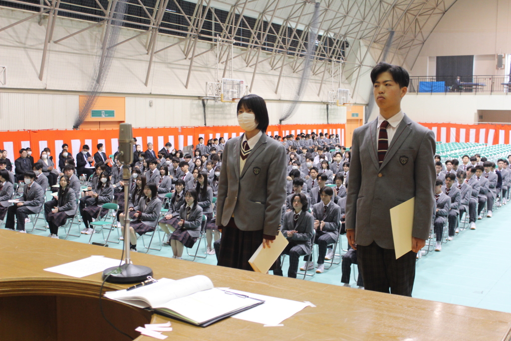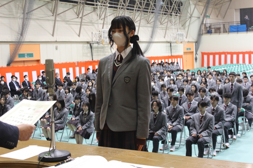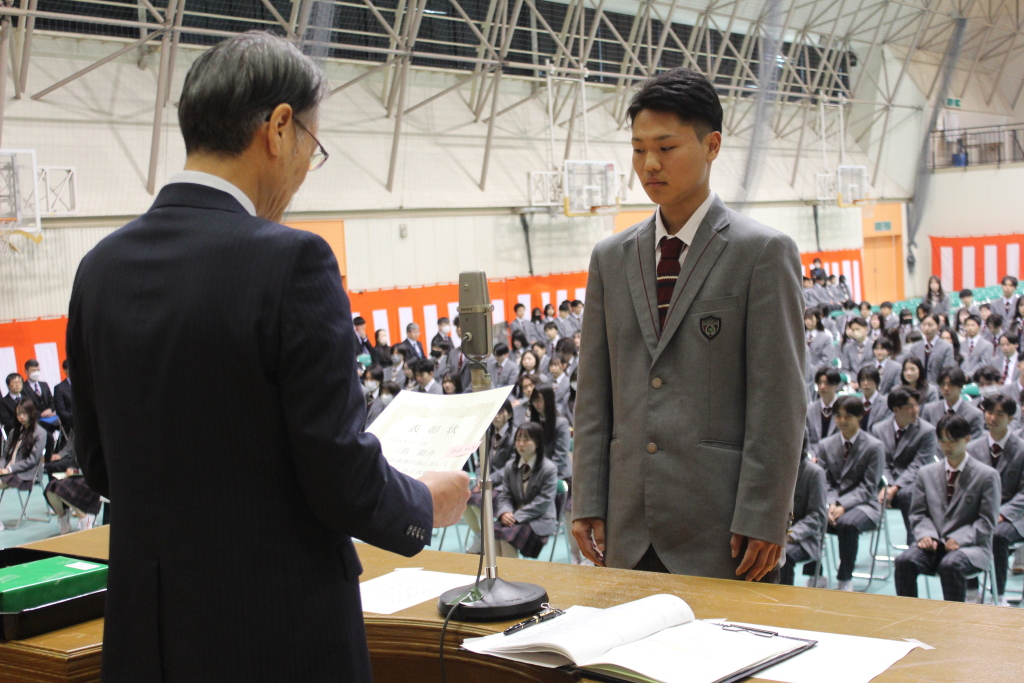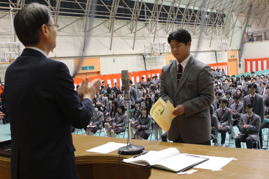 校外表彰では、学業・人物共に優秀な生徒2名、またスポーツで顕著な成績を収めた生徒30名が表彰されました。校内表彰では、部活動や委員会で活躍した特別活動賞では27名、三年間皆勤賞では7名、三年次一年間皆勤賞では32名が受賞し、それぞれの代表者が近藤校長から賞状が渡されました。