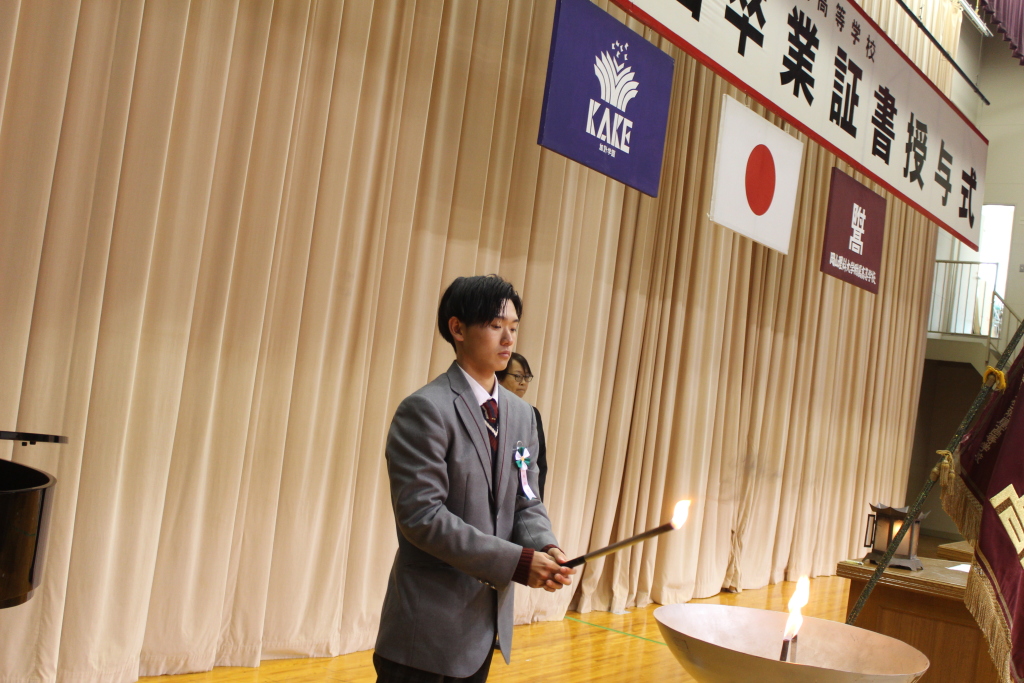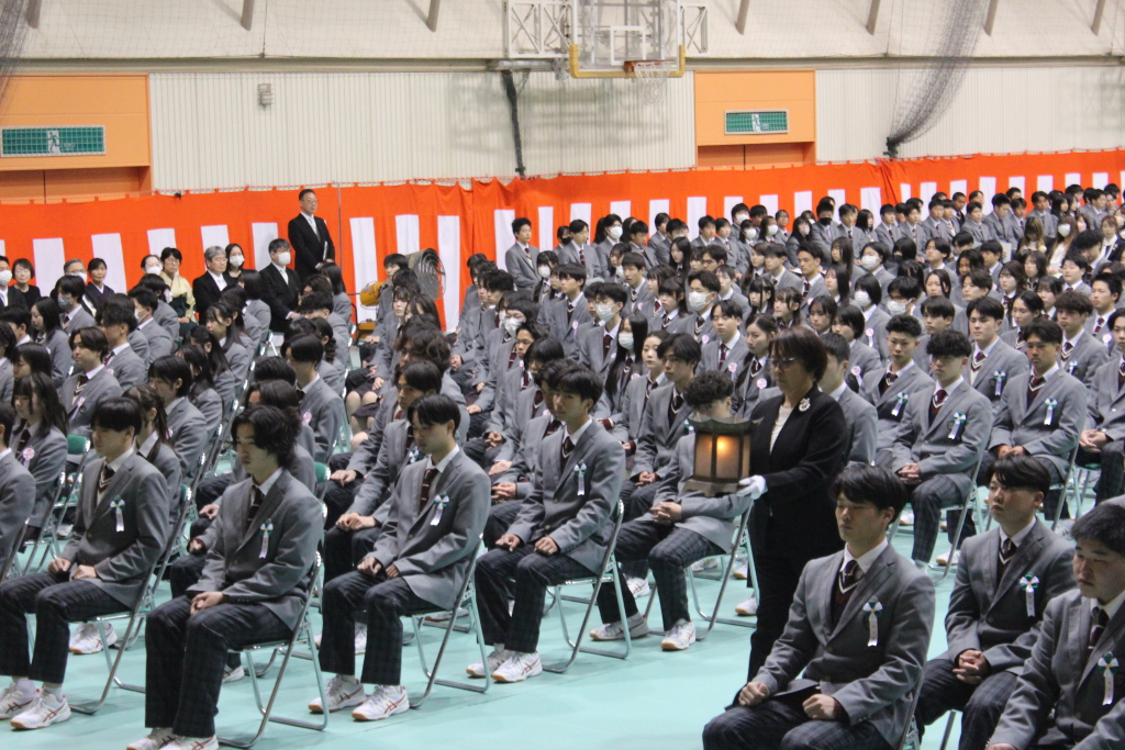 ゆっくりと静まりかえると厳粛な雰囲気変わり、会場には「不滅の法灯」が入場しました。3年間消えることなく生徒たちを見守ってきた法灯が、テニス部で活躍した中島 璃人さん(スポーツサイエンスコース)の手により、点火されると会場は凛とした空気の中で開会しました。