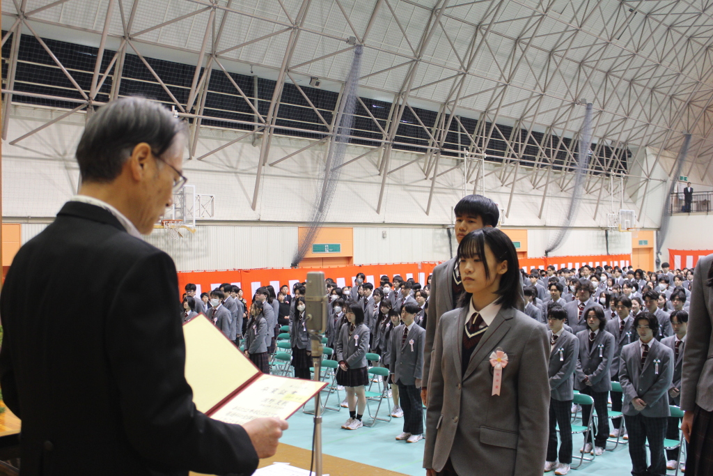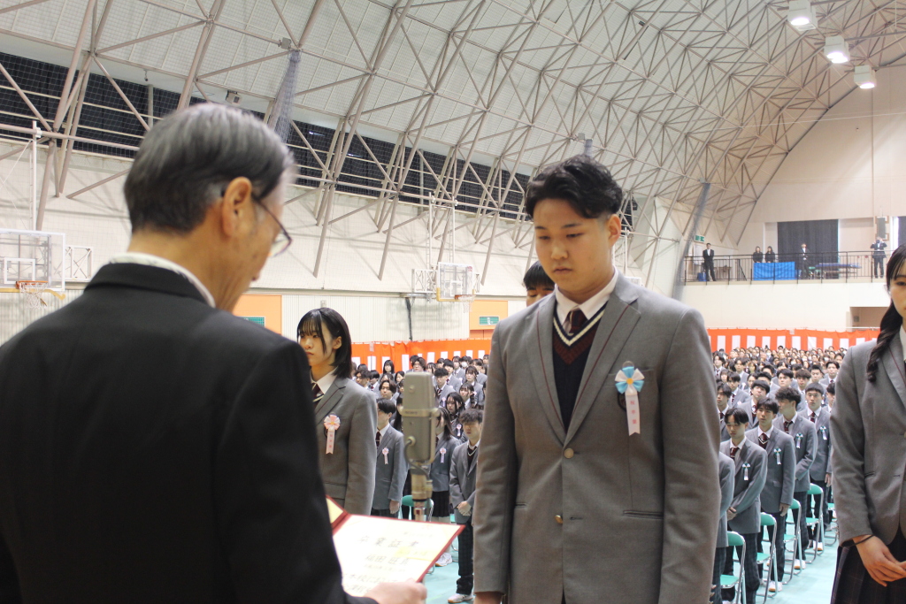 式典では、各コース代表の生徒が、近藤校長から卒業証書を受け取りました。 続いて、全国大会において3位以上の成績を収めた生徒を対象に表彰する総長賞をアーバンスポーツ部1名、テニス部1名、ハンドボール部2名が受賞し、理事長から授与されました。