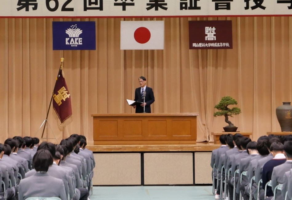 先ほど、校外表彰である日本私立中学校高等学校連合会会長表彰や岡山県高体連の優秀選手表彰などを受賞された皆さん、また、校内表彰である特別活動表彰と三年間皆勤賞、三年次一年間皆勤賞を授与された皆さん、本当におめでとうございます。心からお祝いを申し上げます。